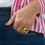 Anello bold in acciaio inox placcato oro 18k, dal design pieno e moderno. Un gioiello statement, perfetto per completare look decisi e sofisticati.